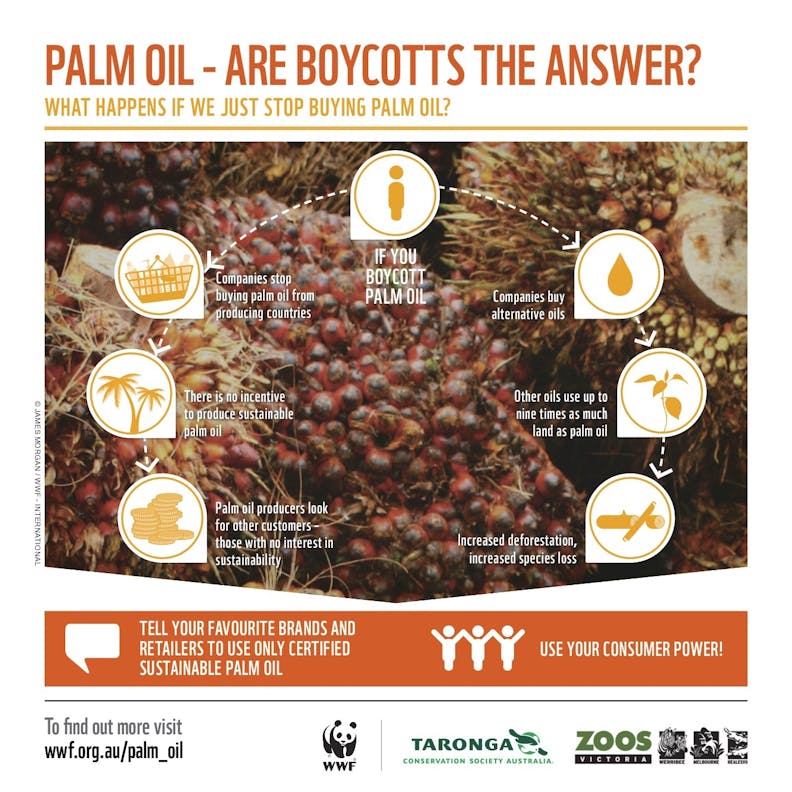 Palmolie wordt soms geboycot vanwege misstanden als ontbossing, milieuvervuiling of sociaaleconomische problemen. De Nederlandse oliën- en vettensector is er - net als bijvoorbeeld het Wereld Natuur Fonds - van overtuigd dat het boycotten van palmolie geen oplossing is voor de problemen. Deze illustratie van het Wereld Natuur Fonds maakt duidelijk wat er gebeurt als we palmolie boycotten: